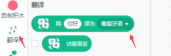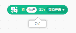 Scratch 提供了很多国家语言的文本翻译功能,输入文字,点击之后就会出现翻译的结果。
