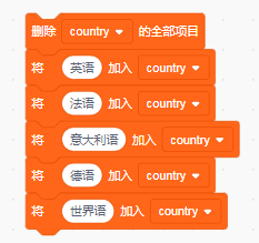 这个作品的实现,我们首先使用了列表功能,把需要的数据项存入一个叫做 “国家 country” 的列表中: