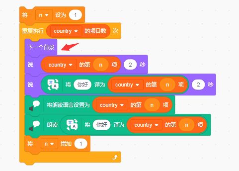 然后,对这个 country 的列表进行循环操作,每次取出列表中的一个数据,应用翻译和朗读模块,将 “你好” 翻译成不同国家的文字,再朗读出来。