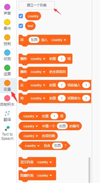 我们来看下 Scratch 中列表的使用,“列表 list” 位于变量代码块组中: